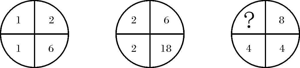 真題2屬于數(shù)圖推理,此類題目涉及的圖形多是餅圖、拼圖、三角形、九宮格,由4、5或者9個(gè)數(shù)字構(gòu)成,一般考慮行規(guī)律、列規(guī)律、對角線規(guī)律,或者整體規(guī)律,運(yùn)用所給數(shù)字做基本的四則運(yùn)算,偶爾會(huì)在給定數(shù)字基礎(chǔ)上添加一個(gè)不復(fù)雜的常數(shù)項(xiàng),比如加1、乘以2、除以3等。把握??家?guī)律,多總結(jié)多思考做題思路,這是處理此類題的良方。本題思路:左上角數(shù)字×右下角數(shù)字=3×左下角數(shù)字×右上角數(shù)字,1×6=3×1×2、2×18=3×2×6所以,?=4×8×3÷4=24;故答案為D。