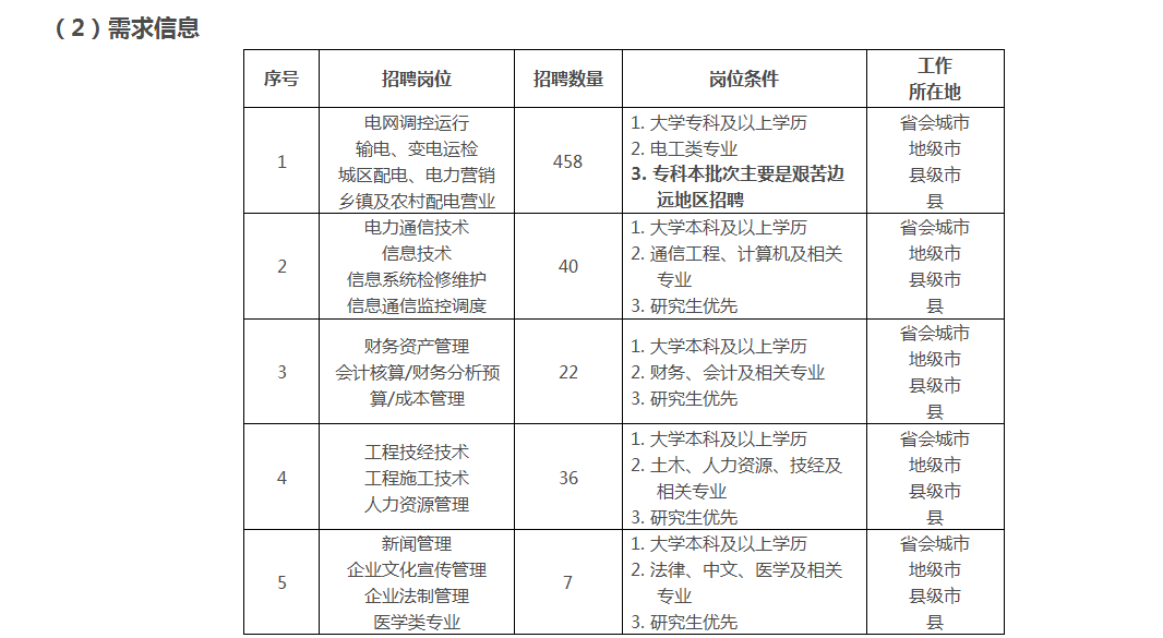 注意:1.招聘崗位只列舉了部分大類,凡應(yīng)聘者均需要服從安排;2.電工類專業(yè)每個(gè)單位都有需求,??票九沃饕瞧D苦邊遠(yuǎn)地區(qū)招聘,具體請(qǐng)應(yīng)聘者咨詢各用人單位;3.歡迎大家踴躍報(bào)名應(yīng)聘,審慎選擇調(diào)劑,我們將根據(jù)報(bào)名應(yīng)聘人數(shù)、生源總體素質(zhì)、考試考核成績(jī)等適度調(diào)劑調(diào)整或新增各批次之間以及相關(guān)單位之間的招聘數(shù)量和專業(yè);4.非電工類崗位和專業(yè)主要參考“附件1”,在具體招聘過(guò)程中,我們將根據(jù)實(shí)際情況進(jìn)行調(diào)劑調(diào)整;5.本表存在疑問(wèn)或歧義的地方統(tǒng)一以國(guó)網(wǎng)四川省電力公司解釋為準(zhǔn)。