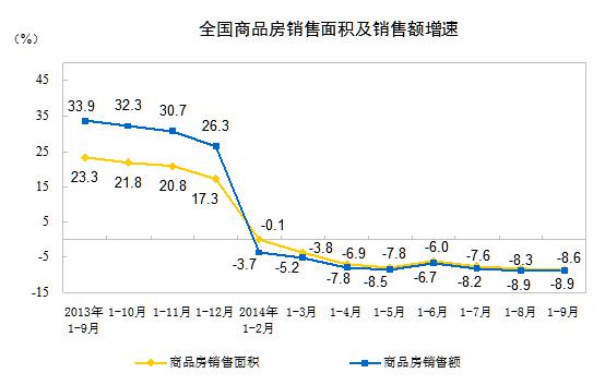 2014年1-9月份,商品房銷售面積77132萬平方米,同比下降8.6%,降幅比1-8月份擴大0.3個百分點。其中,住宅銷售面積下降10.3%,辦公樓銷售面積下降9.5%,商業(yè)營業(yè)用房銷售面積增長7.0%。商品房銷售額49227億元,下降8.9%,降幅與1-8月份持平。其中,住宅銷售額下降10.8%,辦公樓銷售額下降19.7%,商業(yè)營業(yè)用房銷售額增長6.8%。