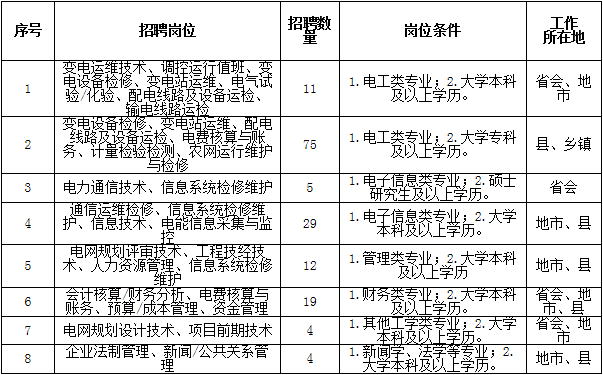 招聘單位包括國(guó)網(wǎng)呼倫貝爾供電公司、國(guó)網(wǎng)興安供電公司、國(guó)網(wǎng)通遼供電公司、國(guó)網(wǎng)赤峰供電公司等四家市供電公司及所屬縣級(jí)供電企業(yè);國(guó)網(wǎng)蒙東經(jīng)研院、國(guó)網(wǎng)蒙東電科院、國(guó)網(wǎng)蒙東檢修公司、國(guó)網(wǎng)蒙東信通公司。擬招聘崗位信息見下表: