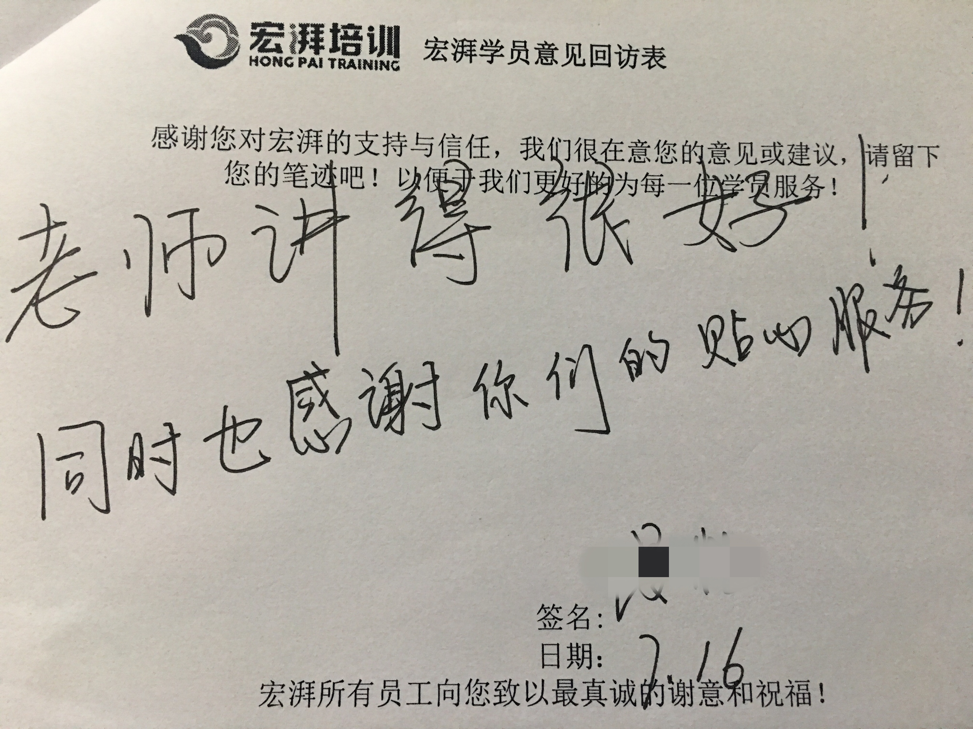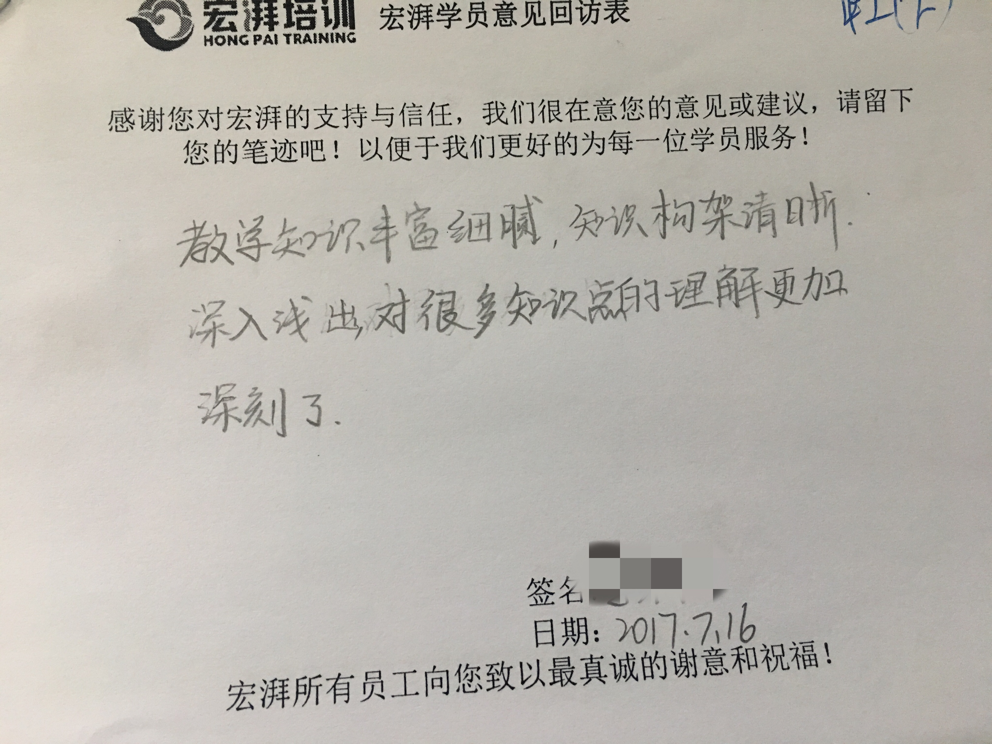 一次偶然的機會,咨詢了宏湃。本來是抱著試試看的態(tài)度問問的,但是宏湃的老師很是熱心。不僅僅給我介紹了他們的課程。還對我之前應(yīng)聘失敗之路給了很多專業(yè)的建議。我很是震驚,當(dāng)看到宏湃的教材時候,我瞬間驚呆了。完全和自己之前復(fù)習(xí)的課程內(nèi)容不一樣,感覺還有好多知識我沒有掌握,因此我抱著試試的心態(tài)參加了宏湃的培訓(xùn)班。他們的課程安排很合理,課后還有大量的習(xí)題,很有針對性,每次做完習(xí)題都會有不小的收獲。最重要的是,我不是一個人在孤軍奮戰(zhàn)了,有不明白的可以問老師,同學(xué)之間也能互相幫助、互相學(xué)習(xí)。