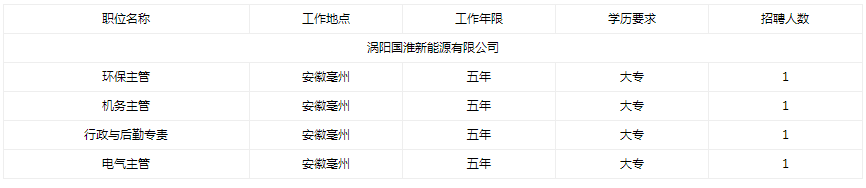 一、招聘崗位及人數(shù) 序號 單位 部門及崗位 招聘人數(shù) 1 渦陽國淮新能源公司 行政與后勤專責(zé) 1 2 渦陽國淮新能源公司 電氣主管 1 3 渦陽國淮新能源公司 環(huán)保主管 1 4 渦陽國淮新能源公司 機(jī)務(wù)主管 1 備注:國家電投系統(tǒng)內(nèi)員工優(yōu)先錄用。