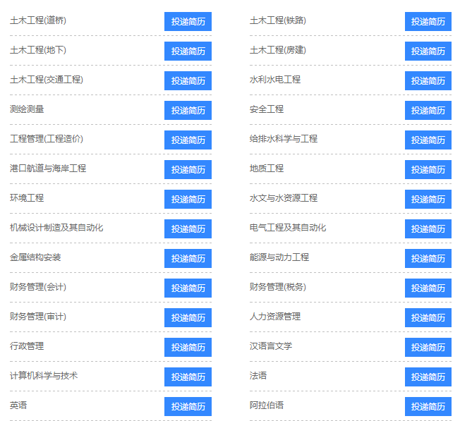 土木工程(道橋、鐵路、地下、房建、交通工程等)、水利水電工程、測(cè)繪測(cè)量、安全工程、工程管理(工程造價(jià))、給排水科學(xué)與工程、港口航道與海岸工程、地質(zhì)工程、環(huán)境工程、水文與水資源工程、機(jī)械設(shè)計(jì)制造及其自動(dòng)化、電氣工程及其自動(dòng)化、金屬結(jié)構(gòu)安裝、能源與動(dòng)力工程、財(cái)務(wù)管理(會(huì)計(jì)、稅務(wù)、審計(jì))、人力資源管理、行政管理、漢語言文學(xué)、計(jì)算機(jī)科學(xué)與技術(shù)、法語、英語、阿拉伯語等專業(yè)。